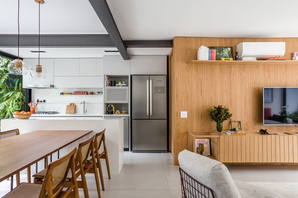 จากมุมนี้ เราจะเห็นพื้นที่โต๊ะรับประทานอาหารที่ข้าง ๆ จะเป็นห้องครัว และด้านนอกก็ยังมีห้องครัวเอาไว้อีกแห่งด้วย จึงสามารถประกอบอาหารได้ทุกโอกาสตามความต้องการ