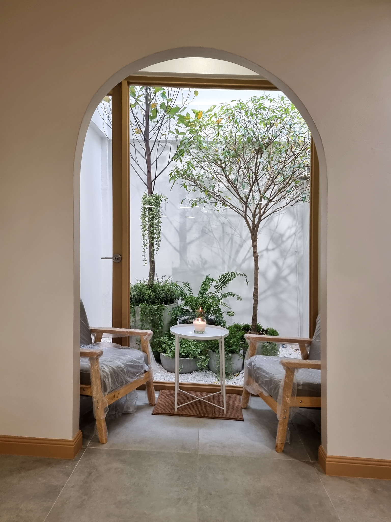 เดิมทีมุมนี้เป็นห้องเล็ก ๆ ที่ตอนนี้ถูกเจาะเพดานเพื่อรับแสง พร้อมจัดเป็นสวนเล็ก ๆ และมุมนั่งเล่น