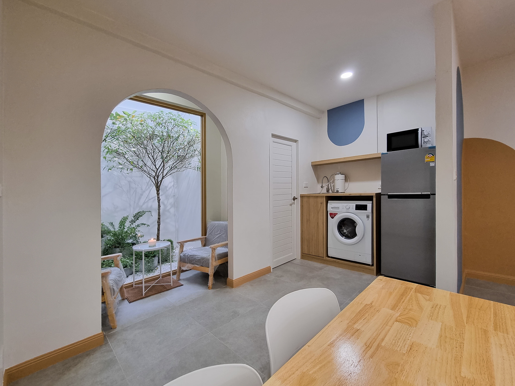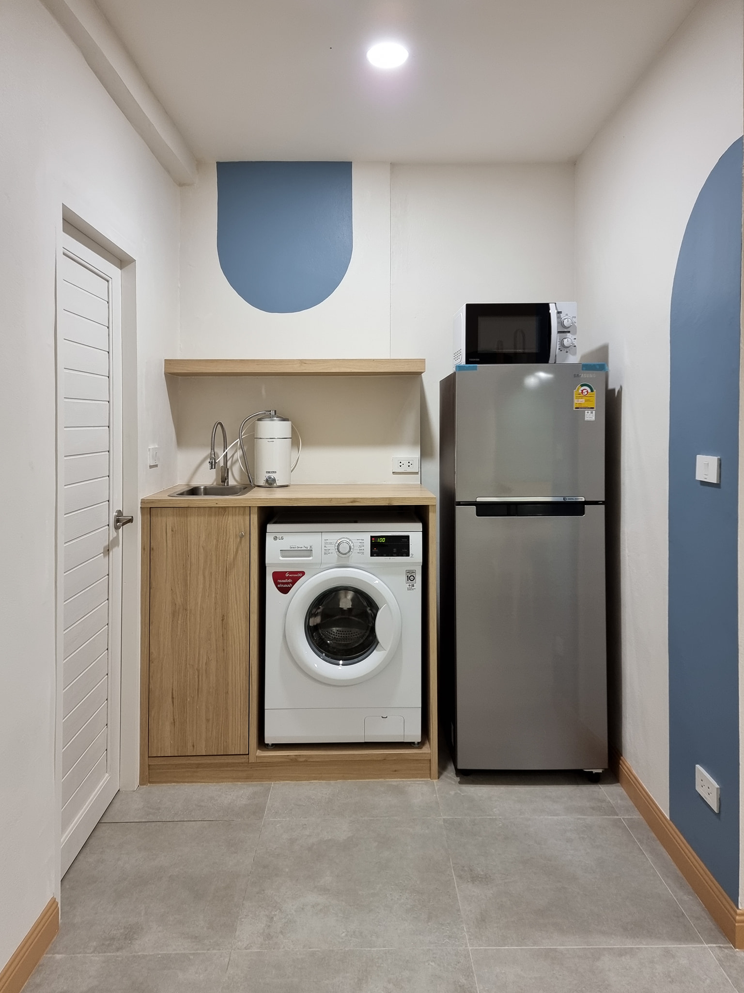 มุมหนึ่งจากห้องครัว ซึ่งเป็นมุมที่เข้ากับวิถีชีวิตของคนยุคใหม่ เป็นพื้นที่เล็ก ๆ ที่อัดแน่นไปด้วยสิ่งอำนวยความสะดวกที่สามารถทำอาหาร ซักผ้า ได้แบบง่าย ๆ ในมุมเดียว