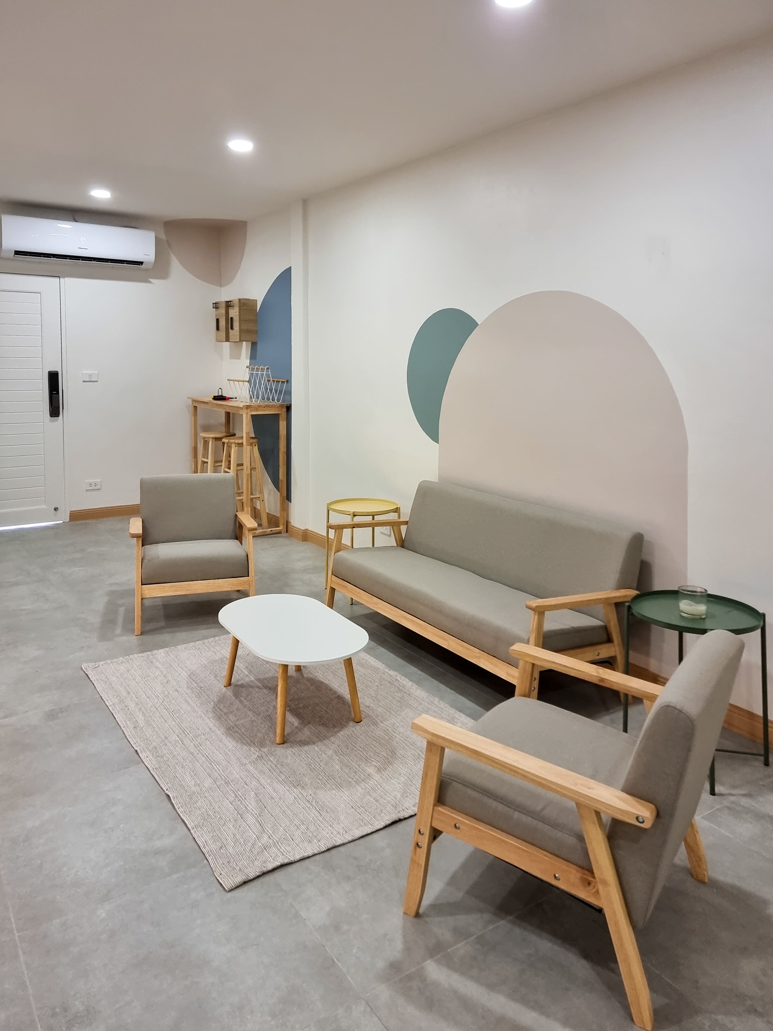 ภายในห้องนั่งเล่นได้รับบรรยากาศที่ผ่อนคลายและดูสว่างขึ้น ผ่านการเลือกใช้โทนสีที่สว่าง ผสานไปกับเฟอร์นิเจอร์ไม้สีอ่อน