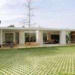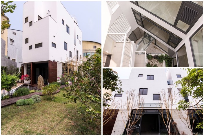 อันดับแรกคือการจัดบริบท ด้วยที่ว่า บ้านอยู่ในตัวเมือง มีพื้นที่น้อย จึงออกแบบหน้าบ้านลานคอนกรีต ตัดกับสวนหย่อมแบบสมัยใหม่ ใช้รูปทรงเรขาคณิต ตกแต่งเพียงน้อยกับไม้ยืนต้น ตามฟอร์มโมเดิร์นอีกด้วย