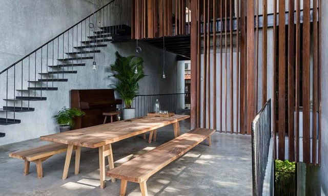 บ้านโครงสร้างคอนกรีต ดีไซน์ช่องเปิดให้ทันสมัย งานไม้สลับไปกับกระจก มุมมองของบ้านจึงดูโดดเด่น น่าเชื้อเชิญเข้ามาอยู่เป็นที่สุด ตกแต่งจากคอนกรีตเปลือย มีลูกเล่นในช่องแสงจำนวนมากของตัวผนังและจับคู่กับหลังคาเพิง ลาดเอียงไปด้านข้างเก๋ๆ ดูทันสมัยมาก