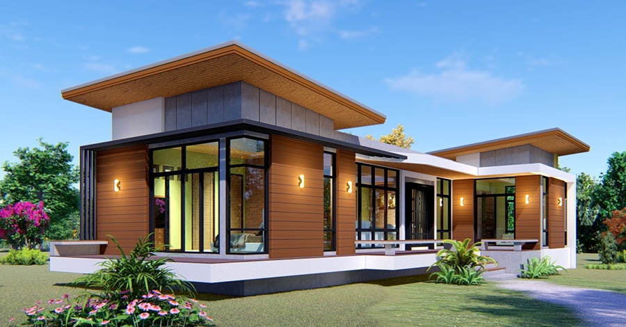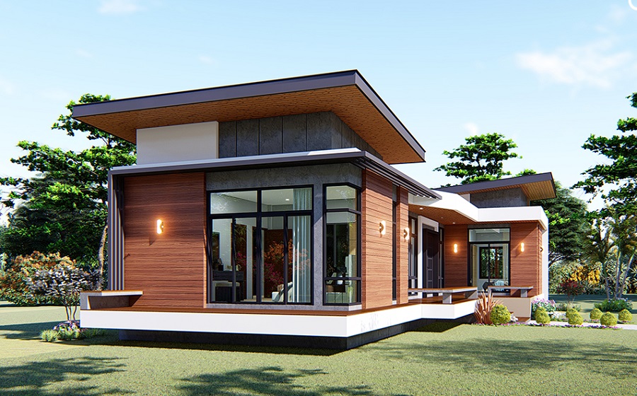 ลักษณะตัวบ้านชั้นเดียว ดีไซน์บ้านเน้นความทันสมัยด้วยรูปทรงที่มีเอกลักษณ์ หลังคาทรงเพิงแหงน ผนังภายนอกตกแต่งด้วยโทนสีเทา เสริมด้วยผนังไม้ฝา ฝ้าไม้ และเชิงชายไม้ ให้บรรยากาศโดยรวมดูอบอุ่นนุ่มนวลขึ้น