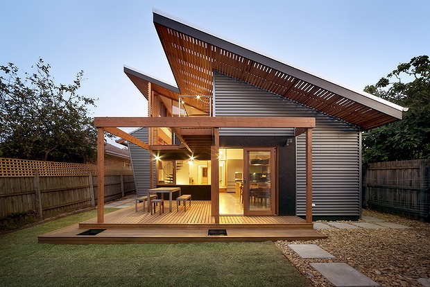 การออกแบบบ้านนั้นโดดเด่นทั้งวัสดุเมทัลชีท ไม้ และกระจกที่เลือกใช้มาผสมผสานกัน รูปทรงของเส้นตรงทั้งแนวตั้ง แนวนอน และแนวทแยง โดยเฉพาะหลังคาแบบลาดเอียง