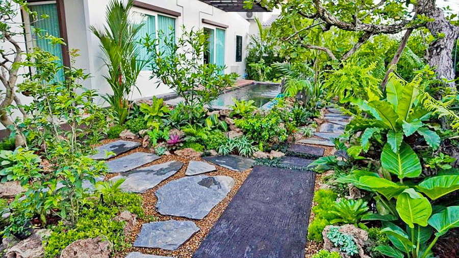 สวนที่เราจะพาไปชมในวันนี้ เป็นสวนสไตล์ทรอปิคอลขนาด 60 ตารางเมตร ใช้เวลาในการจัด 11 วัน กับคนงาน 4 คน โดยจะเน้นการใช้พืชเมืองร้อนเป็นหลักในการสร้างพื้นที่ให้ร่มเงาแก่บ้าน พร้อมด้วยการจัดวางทางเดินที่ให้บรรยากาศใกล้ชิดธรรมชาติสุดๆ