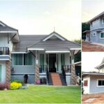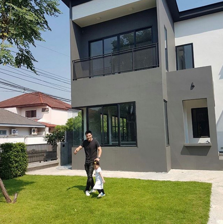 บ้านหลังนี้ตกแต่งสไตล์โมเดิร์น เน้นโทนสีเทาแบบเท่ ๆ บริเวณหน้าบ้านมีต้นไม้รอบ ๆ บ้านและสนามหญ้าสีเขียวสดใส ดูร่มรื่นและเย็นสบายตา ซึ่งเป็นพื้นที่สำหรับเล่นสนุกและทำกิจกรรมนอกบ้านของครอบครัวโดยเฉพาะ