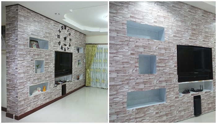 วันนี้ ในบ้าน ก็มีไอเดียสำหรับ ตกแต่ง ‘ห้องรับแขกบิวท์อิน’ มาฝากชาวเว็บทุกท่าน เป็นรีวิวจากคุณ pocoyo windmill ที่ได้เปลี่ยนมุมดูทีวีเล็กๆ ให้กลายเป็นชั้นวางทีวีบิวท์อิน โดยติดวอลล์เปเปอร์ลายหินทรายสวยงาม เพิ่มมิติที่ดูเป็นธรรมชาติ พร้อมกรุช่องสำหรับวางของประดับน่ารักๆ ดีไซน์ออกมาจะเป็นอย่างไร ลองไปชมกันเลยค่ะ