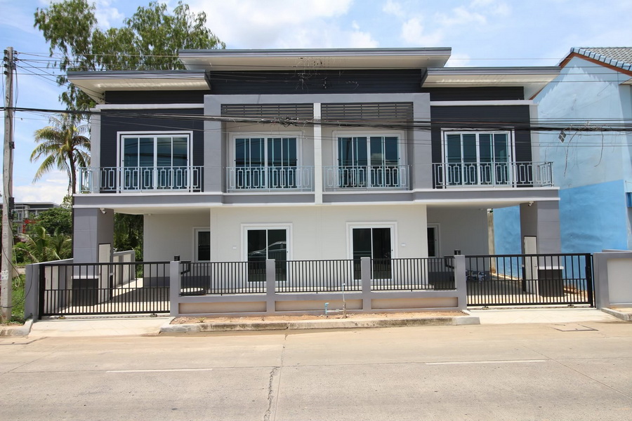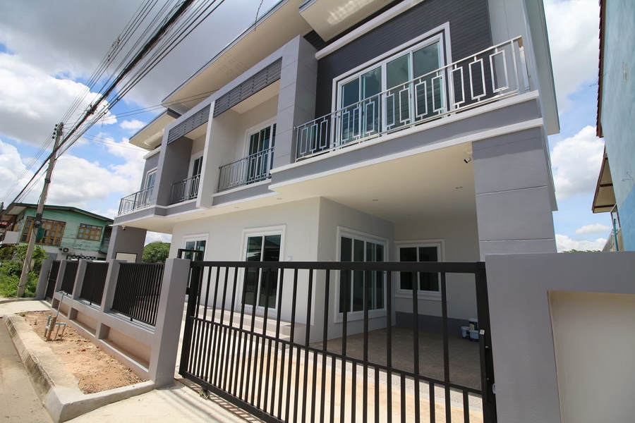 สำหรับบ้านแฝดหลังนี้เป็นบ้านขนาดสองชั้น หากมองเผิน ๆ อาจจะคิดได้ว่าเป้นบ้านแนวทาวน์เฮ้าส์ได้ เพราะบ้านแต่ละหลังออกแบบได้สมมาตรกัน ตัวบ้านออกแบบในสไตล์โมเดิร์น ให้ดีไซน์และเส้นสายที่คมชัดสวยงาม ด้านการตกแต่ง ผนังภายนอกเลือกใช้โทนสีขาวครีมยืนพื้น เพิ่มสีสันให้สะดุดตาด้วยสีเทา