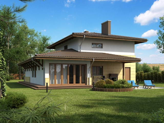 ตัวบ้านโครงสร้างคอนกรีต ออกแบบแบบแปลนบ้านที่เรียบง่าย เป็นสองชั้น และตกแต่งด้วยผนังปูนฉาบเรียบ เสริมลูกเล่นด้วยไม้ในรอบๆ บ้าน จับคู่กับหลังคาทรงจั่ว ดูสวยงามและภูมิฐานในเวลาเดียวกัน โทนสีอบอุ่น เหมาะกับบ้านที่ครบครันแบบครอบครัวใหญ่