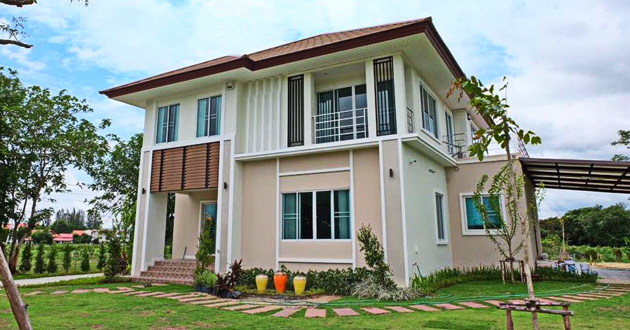 แบบบ้าน U170 มาในรูปแบบของบ้านสองชั้นหลังใหญ่ โครงสร้างคอนกรีตเสริมเหล็ก ผนังภายนอกตกแต่งในโทนสีเบจแซมด้วยคีบปูนสีขาว กรุแต่งเพิ่มลูกเล่นด้วยระแนงไม้สีอ่อน หลังคามุงกระเบื้องลองทรงปั้นหยา ตัวบ้านโอบล้อมด้วยสนามหญ้าและต้นไม้สูงใหญ่ สร้างความร่มรื่นและความสดชื่นให้กับพื้นที่รอบบ้าน