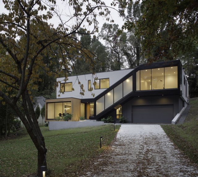 ตัวบ้านรูปทรงโมเดิร์น จากโครงสร้างคอนกรีต ใช้หลังคาสแลป หรือหลังคาทรงแบน ไฮไลท์ของการตกแต่ง ทูโทนของสีตัวบ้าน ขาว-ดำ และพื้นผิวที่แตกแต่งกันไป แถมการเปิดโล่งจากวัสดุที่เลือกใช้ คือกระจกบานใหญ่รอบๆ ตัวบ้าน สร้างความงามแถมได้ประโยชน์อีกมากมาย