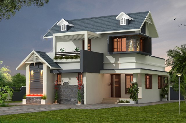 บ้านร่วมสมัยสองชั้น หลังคาทรงจั่วเล่นระดับสวยงาม 3 ห้องนอน 3 ห้องน้ำ