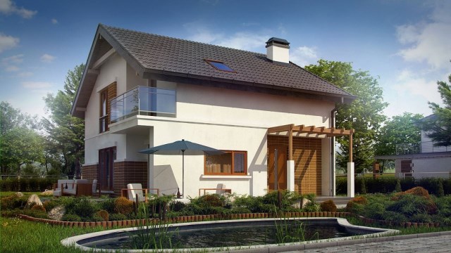 บ้านโครงสร้างคอนกรีต ออกแบบรูปทรงเรียบง่าย แต่ใช้หลังคาจั่วชิ้นใหญ่ ดีไซน์ผนังฉาบเรียบสีขาว ตกแต่งด้วยไม้เป็นลูกเล่้นของตัวบ้านในภายนอก ดูเข้ากันได้ดีและได้สองอารมณ์ไปในตัวอีกด้วย