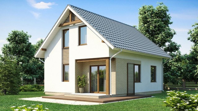 ตัวบ้านโครงสร้างคอนกรีต ตกแต่งจากวัสดุไม้ ในส่วนของกรอบประตูหน้าต่าง และไม้ตกแต่งผนังอาคารตามช่องเปิดต่างๆ ให้อารมณ์ที่อิงแอบธรรมชาติมากขึ้น เลือกใช้หลังคาทรงจั่ว สีฟ้าอ่อนๆ ดูไม่โดดไปจากแบบบ้าน และยังทำให้บ้านดูสบายตาขึ้น หลังคาทรงนี้ เหมาะกับอากาศในบ้านเรามาก เพราะระบายอากาศได้ดี