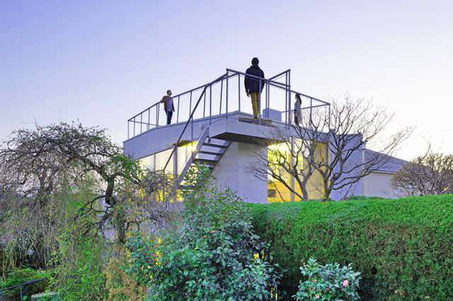 ตัวบ้านตั้งอยู่บนเนินเขา จึงทำให้มีพื้นที่จำกัด เว้นพื้นที่หน้าบ้านเล็กน้อย เป็นสนามหญ้ารอบตัวบ้าน ก่อนเข้าประตูบ้าน แบ่งให้มีทางเข้าสู่โรงจอดรถ ตกแต่งด้วยไม้ยืนต้นเล็กน้อย เสริมความงามแก่ตัวบ้านได้ดี