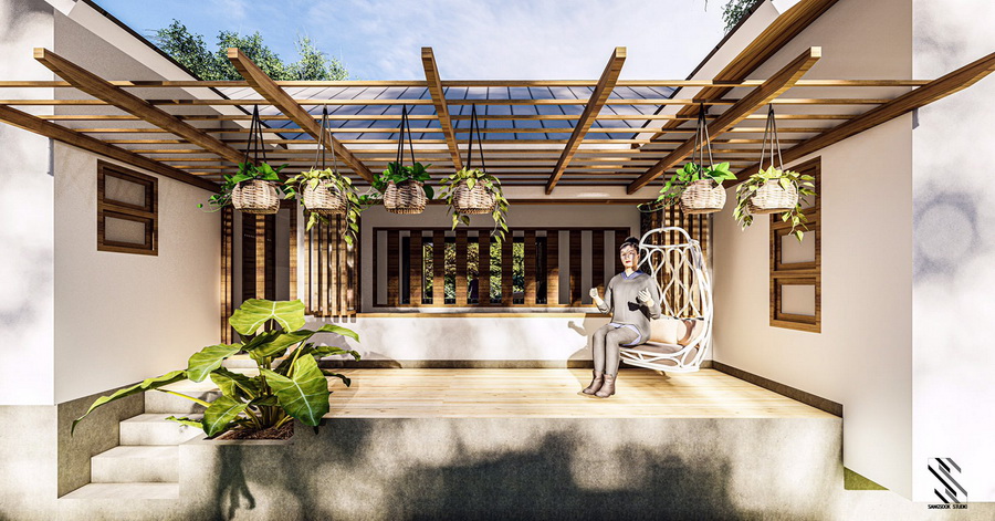 โดยลานที่เปิดโล่งหลังบ้านั้น มีพื้นที่ขนาดพอเหมาะ ด้านบนมีระแนงไม้ติดเอาไว้ จึงสามารถตกแต่งไม่แขวนเล็ก ๆ ไว้เพิ่มความสดชื่นสำหรับการพักผ่อนได้เป็นอย่างดี