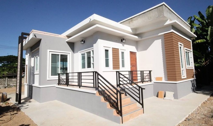 บ้านยกพื้นสูงชั้นเดียว โครงสร้างอิฐฉาบปูน เริ่มจากฐานที่ตกแต่งด้วยโทนสีเทาอ่อน ไล่มาจนถึงผนังสีขาวผสมผสานกับไม้เทียมสีเข้ม และมีบางส่วนเป็นดีไซน์ปูนเปลือย พื้นที่ด้านหนึ่งก่อครีบปูนยื่นออกมาช่วยบดบังและแสง อีกทั้งยังช่วยสร้างเอกลักษณ์และเพิ่มเสน่ห์ชวนมองให้กับบ้านหลังนี้ได้เป็นอย่างดี