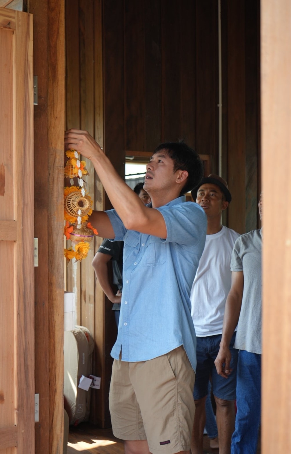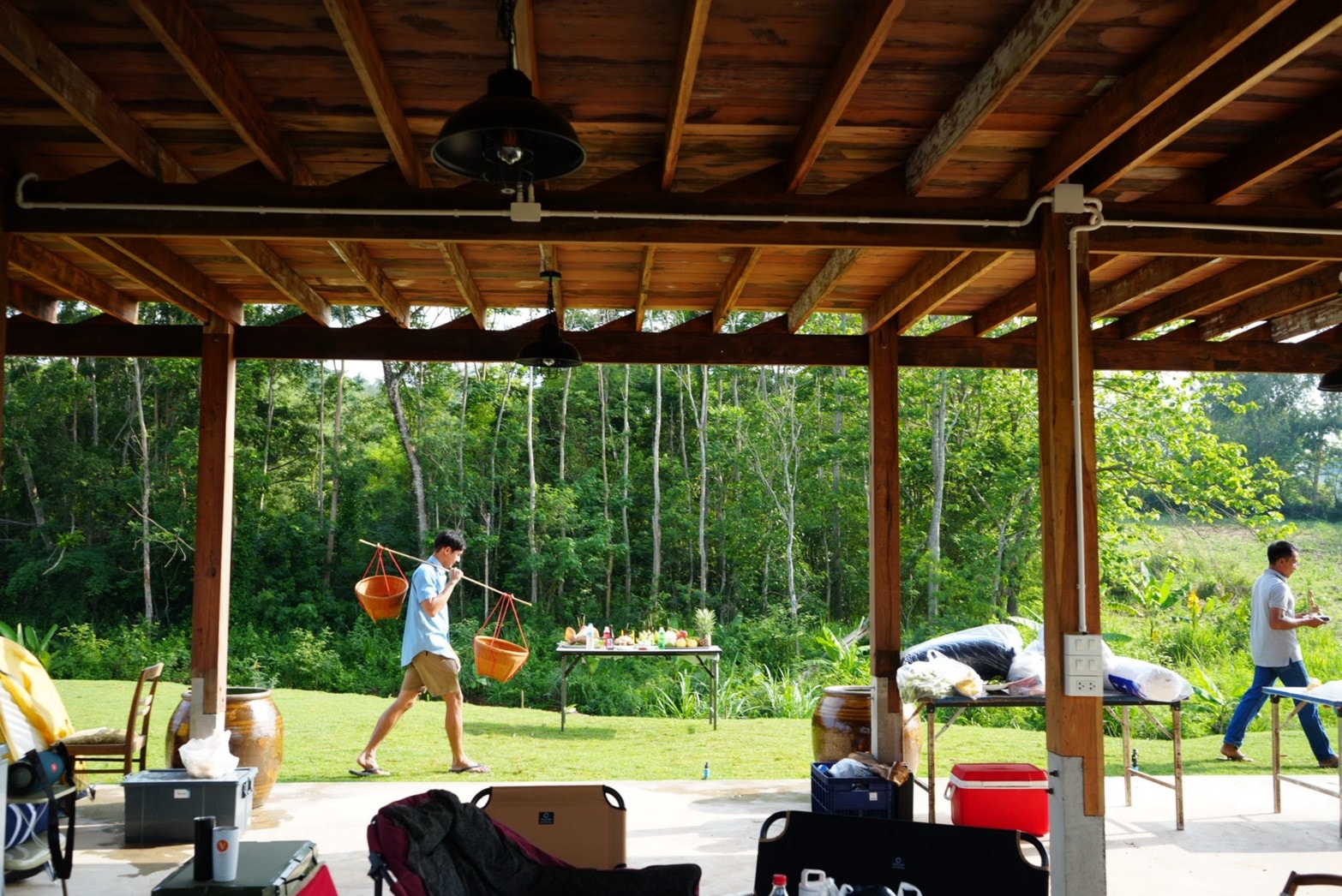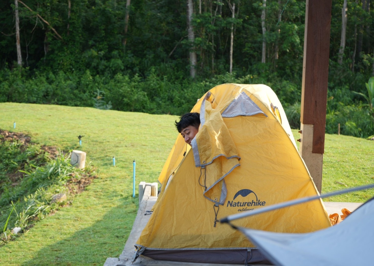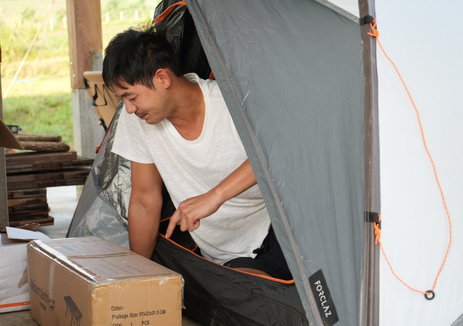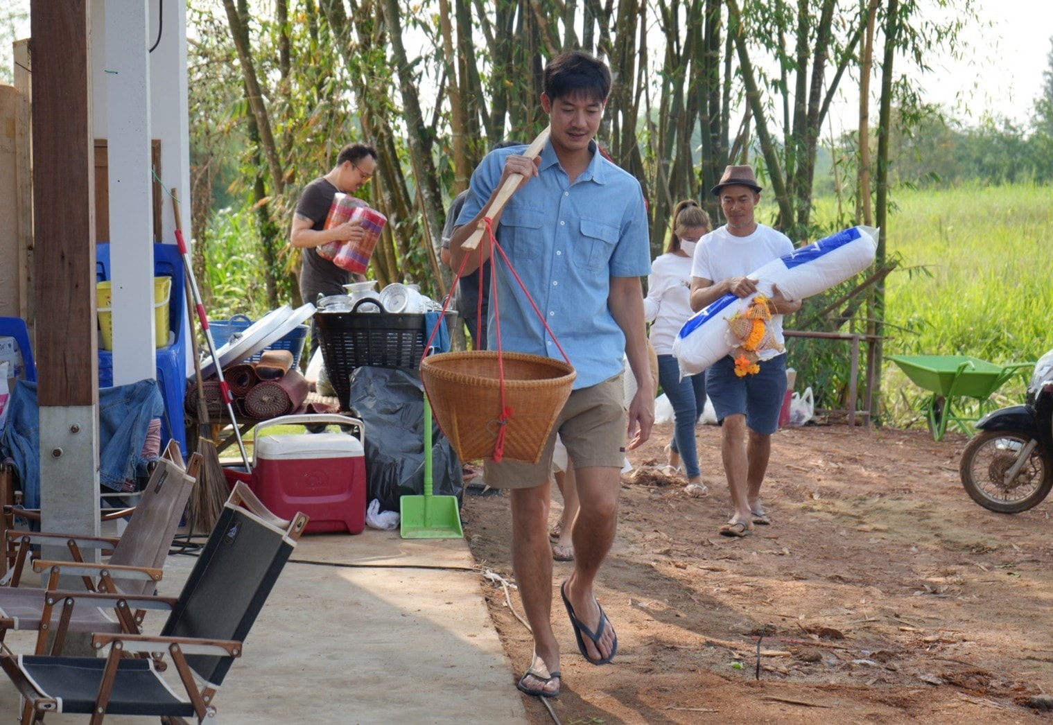 บนบ้านยังตกแต่งไม่เรียบร้อย หนุ่มเวียร์กับเพื่อน ๆ เลยมาใช้พื้นที่ใต้ถุนในการตั้งเต็นท์ ซึ่งก็ให้บรรยากาศที่ดีไปอีกแบบ