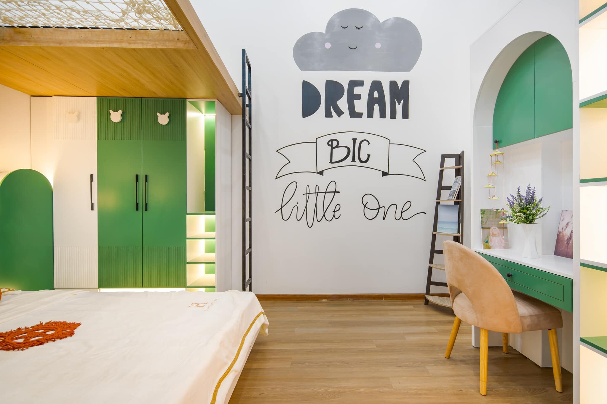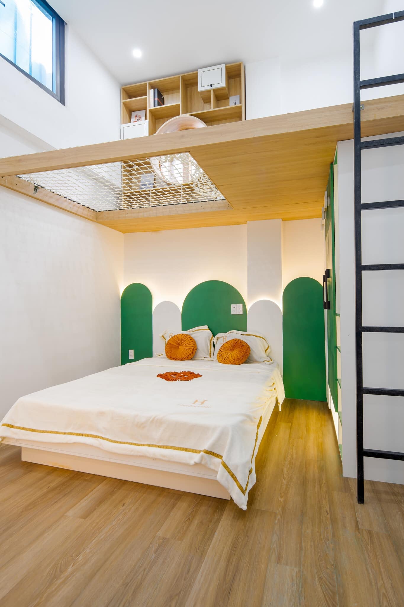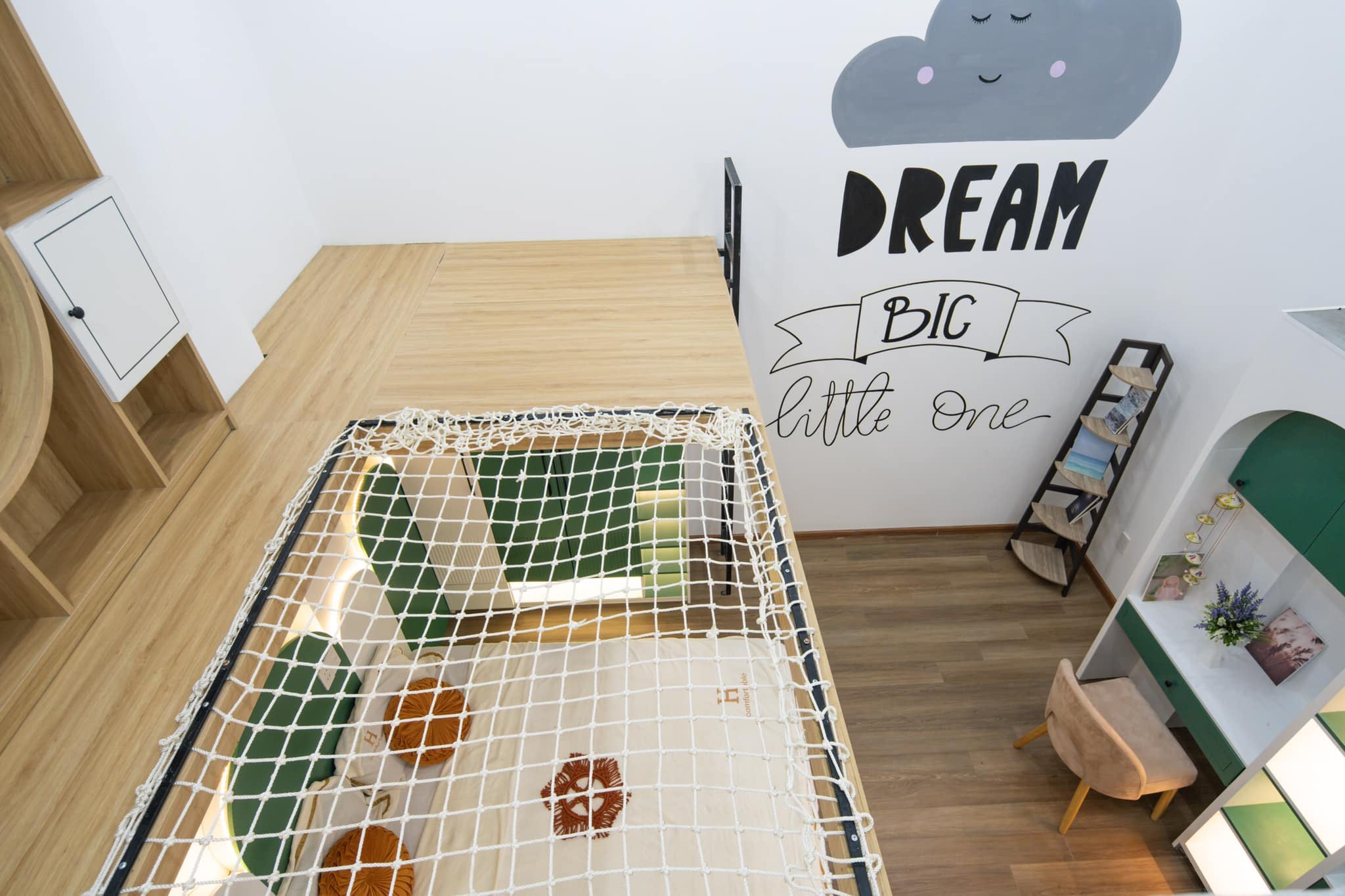 ส่วนของห้องนอนเด็ก ที่ออกแบบให้มีชั้นลอย เด็กที่นอนด้านล่างก็เลยไม่รู้สึกว่าเพดานนั้นสูงเกินไป ขณะเดียวกันก็ได้ประโยชน์อีกอย่าง คือมีพื้นที่ใช้สอย เป็นพื้นที่เล่นสนุก-นั่งเล่น เพิ่มขึ้นมาอีก