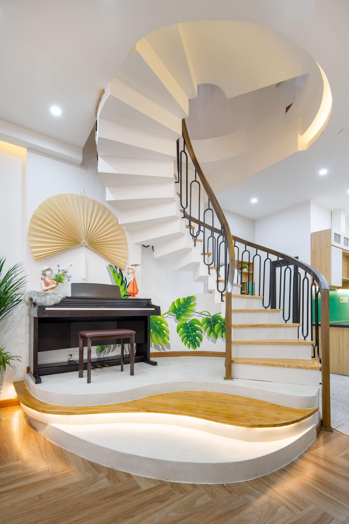 จุดเด่นอีกอย่างหนึ่งคือมุมนี้เลย เจ้าของบ้านน่าจะชอบเล่นเปียโน จึงมีส่วนที่ทำเหมือนเวทีแสดงเปียโน ซึ่งแฝงเอาไว้ในขั้นบันไดที่จะขึ้นสู่ชั้นบน