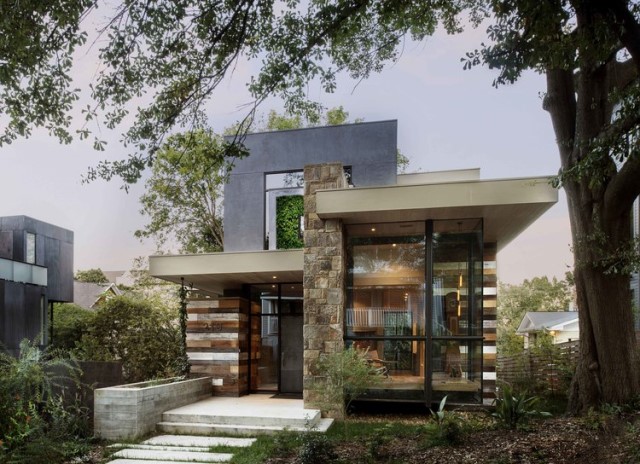 ออกแบบให้ติดกับถนน ใช้ทางเดินคอนกรีตผ่านสนามหญ้าเล็กๆ เข้าสู่ตัวบ้าน และต้นไม้ใหญ่ที่หน้าบ้าน เปิดหน้าบ้านให้สวยงามมากขึ้น เรียบๆ น้อยๆ สะท้อนสวนแบบโมเดิร์น และตกแต่งด้วยทางเดินเท้าคอนกรีตอีกด้วย