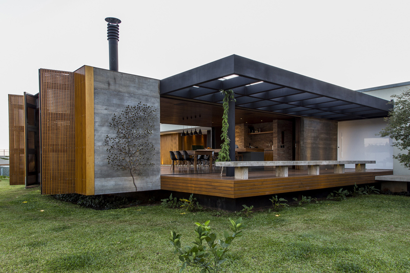 บ้านโครงสร้างคอนกรีต ออกแบบรูปทรงกล่อง ใช้หลังคาทรงแบน ที่ยื่นยาวแบบบ้านสมัยใหม่ สวยงามไปกับผนังไม้ที่ตกแต่งอยู่ กระจก โลหะ ถูกนำมาเติมแต่งให้แก่ตัวบ้านได้สวยงามแบบบ้านสมัยใหม่ยิ่งขึ้น