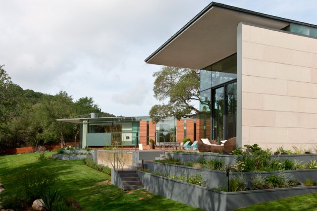 ดีไซน์ตัวบ้านไว้ในสนามหญ้าสีเขียวสด พื้นผิวมีความเป็นเนิน ลาดเอียงเล็กน้อย สร้างสระว่ายน้ำขนาดเล็กๆ เอาไว้รองรับอีกด้วย มีคอร์ดพื้นที่โล่ง เอาไว้กลางตัวบ้าน ดูสวยงาม
