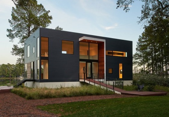 ตัวบ้านโครงสร้างคอนกรีต ออกแบบฟอร์มให้เป็นทรงกล่องสี่เหลี่ยม ที่ตกแต่งด้วยไม้ สีดำเข้ม ดูภูมิฐาน สร้างมุมมองและสะท้อนรสนิยมผู้ใช้งานตัวบ้านได้ดีเยี่ยม ตกแต่งเพิ่มเติมด้วยช่องแสงกระจก ดูทันสมัยมากขึ้น