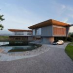 ตัวบ้านโครงสร้างคอนกรีต ดีไซน์รูปทรงกล่องเรียบง่าย โดดเด่นด้วยต้วบ้านที่ยื่นลอย หลังคาสแลปเรียบ เน้นน้ำรูปทรงที่ชัดเจนมากขึ้น ตกแต่งผนังบ้านให้เป็นแบบทูโทน สวยงามแบบเรียบง่าย ตกแต่งด้วยไม้ ในอารมณ์แบบบ้านสมัยใหม่