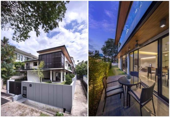 ออกแบบให้ติดกับถนน มีสนามหญ้าเล็กๆ และต้นไม้ใหญ่ หน้าบ้าน เปิดหน้าบ้านให้สวยงามมากขึ้น เรียบๆ น้อยๆ สะท้อนสวนแบบโมเดิร์น และตกแต่งด้วยทางเดินเท้าคอนกรีตอีกด้วย