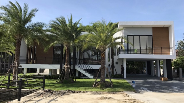 พื้นที่ด้านหน้าจะเป็นสนามหญ้าสีเขียว แซมไปด้วยต้นปาล์ม ช่วยเสริมบรรยากาศให้บ้านสีขาวๆ ไม่ดูจืดชืดจนเกินไป ปูพื้นทางเดินสวนด้วยคอนกรีตเรียบๆ ให้สวนหน้าบ้านดูเป็นสัดส่วน