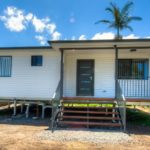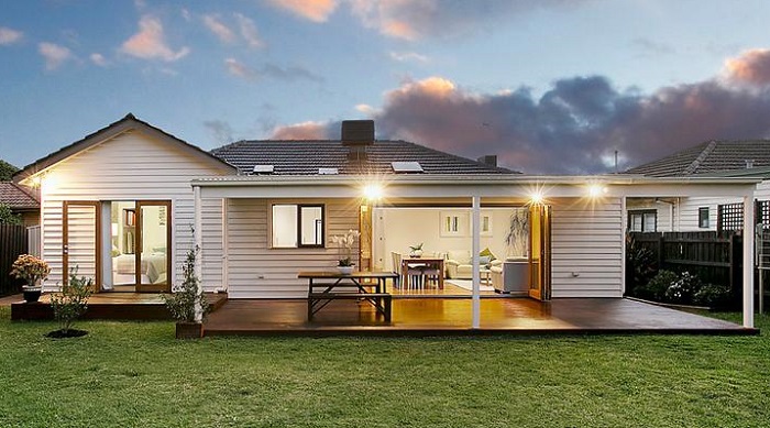 ลักษณะเป็นแบบบ้านชั้นเดียว ผนังภายนอกใช้ไม้ฝาสีขาวเรียงตัวสวย แต่งขอบด้านล่างด้วยสีเทา แถมมีการปูสนามหญ้าสีเขียวด้านหน้าเต็มพื้นที่ ส่วนที่จอดรถปูพื้นด้วยซีเมนต์ง่ายต่อการดูแลรักษา