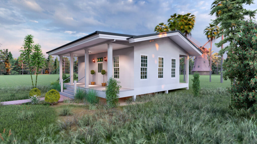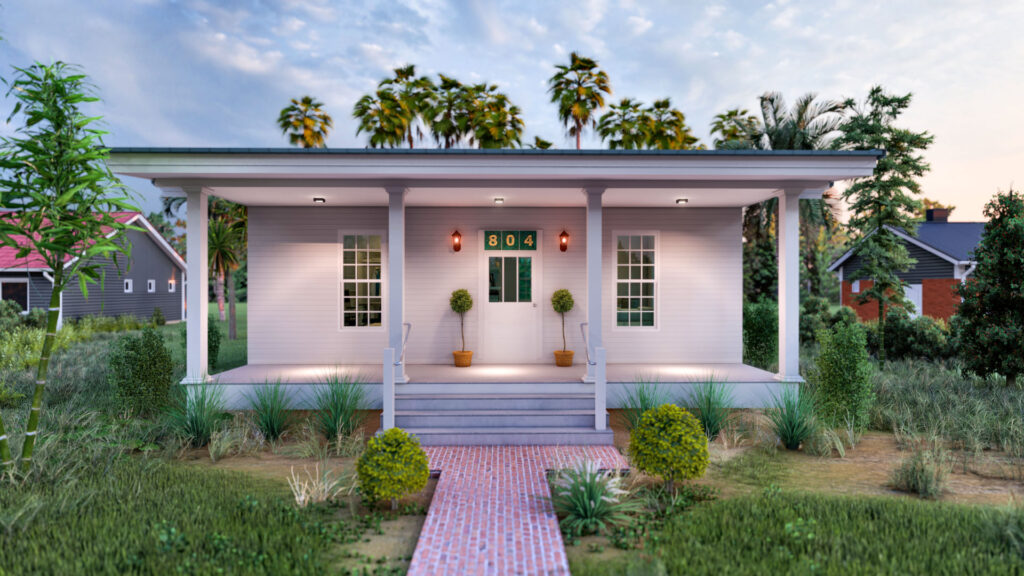 ลักษณะตัวบ้านชั้นเดียว ดีไซน์ยกพื้นใต้ถุนต่ำ หลังคาทรงจั่วหันข้าง ด้านหน้ามีชายคาคลุมระเบียง ผนังภายนอกเลือกใช้วัสดุไม้ทาด้วยสีขาว ในส่วนของประตูหน้าต่างนั้นเลือกใช้สไตล์วินเทจ เรียกได้ว่าเป็นส่วนประกอบที่บ่งบอกสไตล์ของบ้านหลังนี้เลยก็ว่าได้ครับ