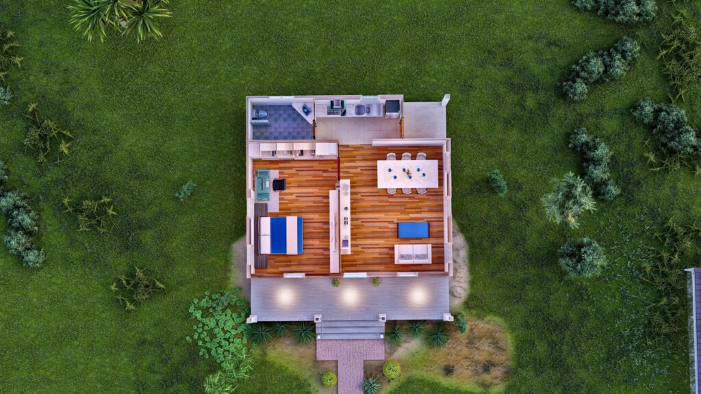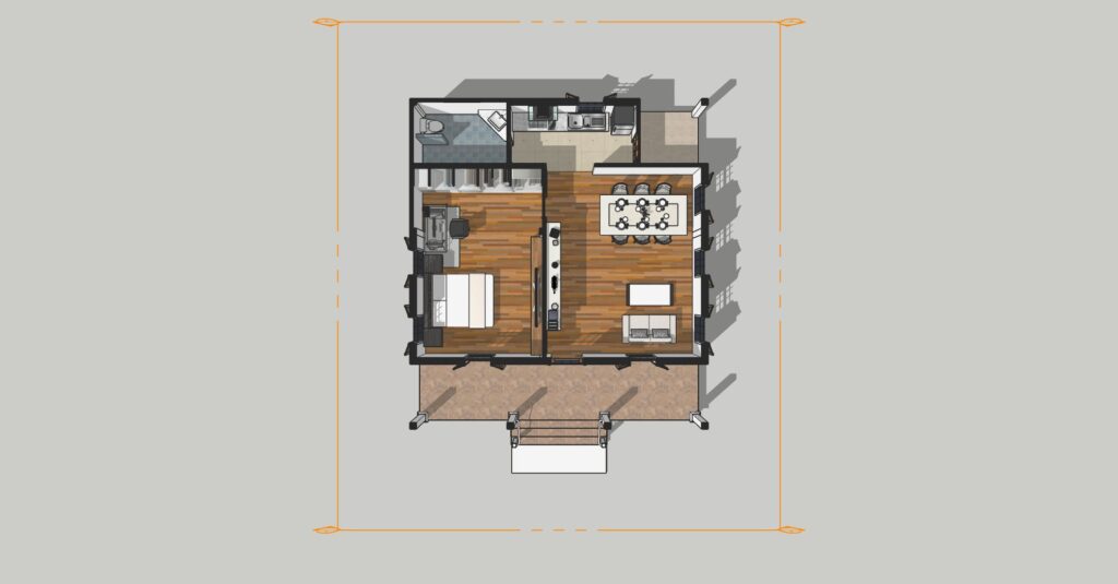 ส่วนหน้าอาคารมีระเบียง เดินเข้าไปในบ้านจะพบกับห้องโถง Open Plan มีมุมนั่งเล่น โต๊ะทานข้าว ห้องครัวและอยู่ด้านหลัง ส่วนห้องนอนจัดไว้ทางซ้ายมือของห้องโถงครับ