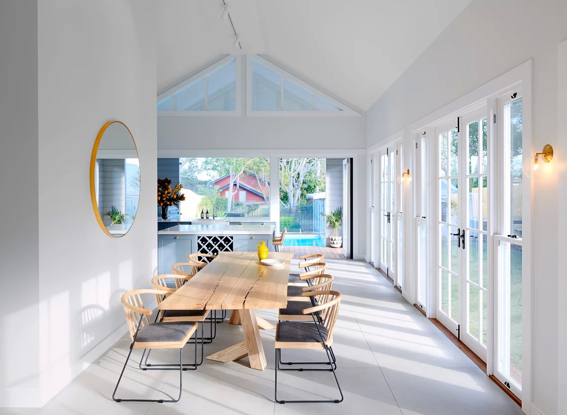 บริเวณพื้นที่โต๊ะรับประทานอาหาร จะตั้งอยู่บริเวณกึ่งกลางของบ้าน ทำให้สามารถเชื่อมต่อกับพื้นที่ภายในบ้าน สนามหญ้าจากด้านข้าง รวมถึงสระว่ายน้ำจากด้านหลังได้อีกด้วย