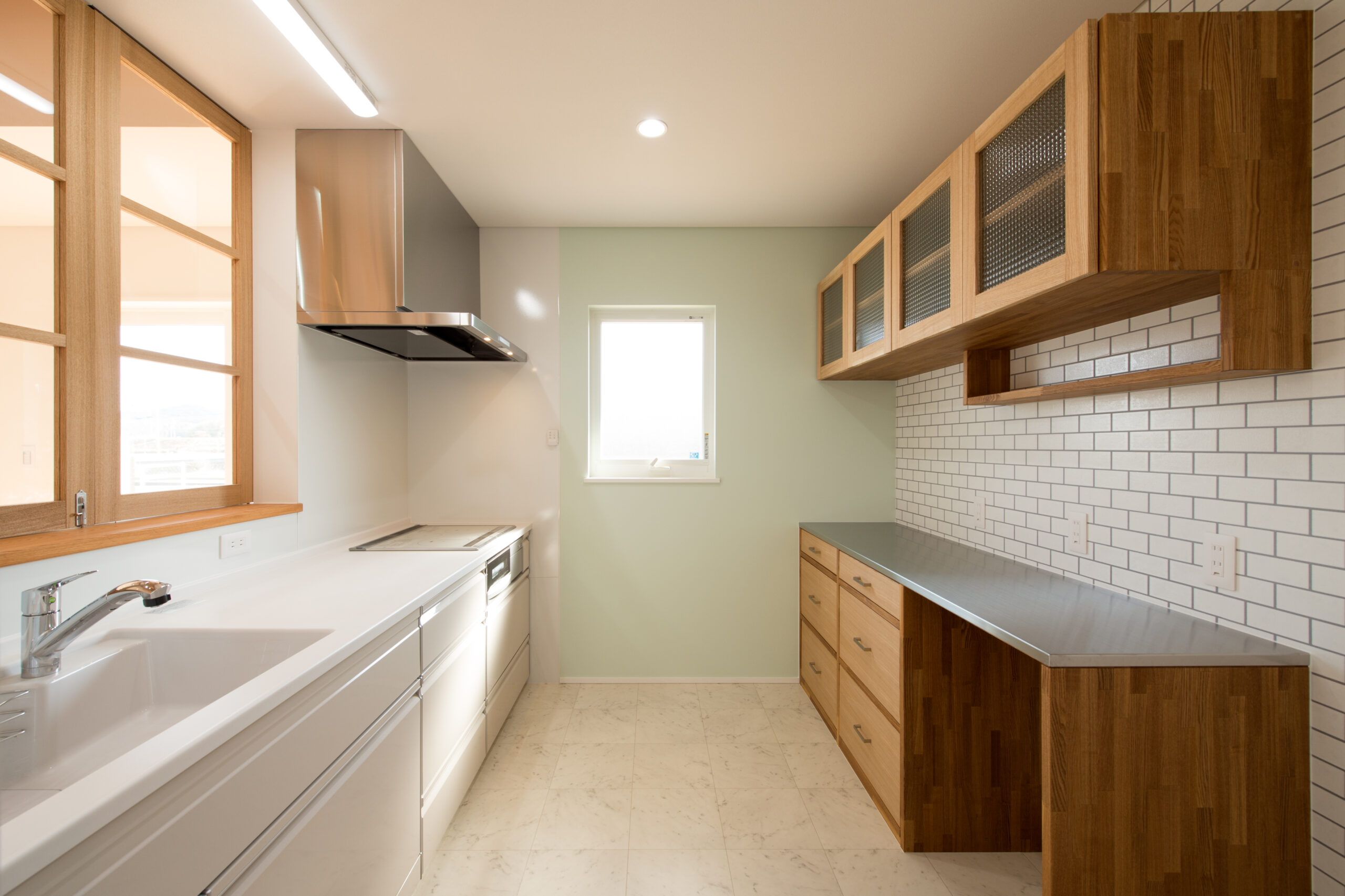 ภายในห้องครัว มีรายละเอียดการตกแต่งที่เรียบง่าย มีการจัดวางเคาน์เตอร์เอาไว้ทั้งสองด้าน ทั้งยังที่หน้าต่างบานใหญ่ไว้ช่วยรับแสงสว่างให้ห้องอีกด้วย