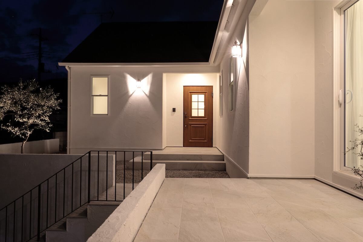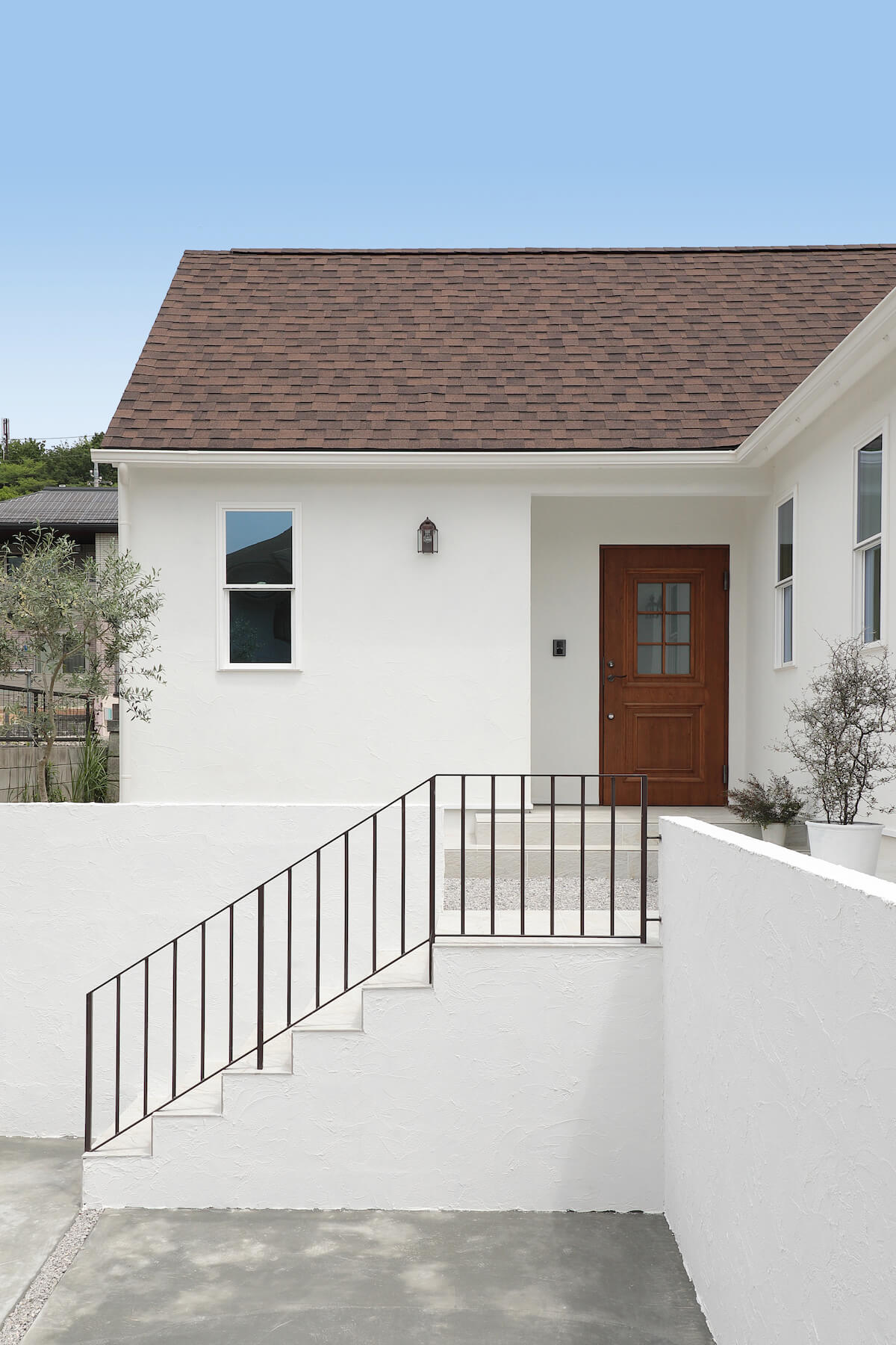 ภายนอกตัวบ้านจะมีเฉลียงเล็ก ๆ ที่ใกล้ ๆ กันนั้นตกแต่งด้วยกระถางต้นไม้เล็ก ๆ เอาไว้ ประตูทางเข้าของบ้านเป็นอีกหนึ่งองค์ประกอบที่มีความสวยงามไม่น้อยเลย ตัวบานประตูเป็นไม้ที่ออกแบบตามแบบประตูสไตล์ยุโรป