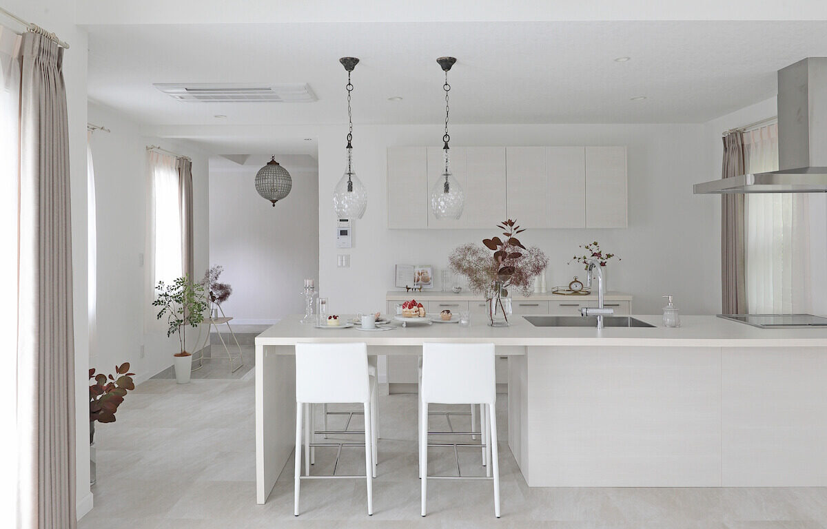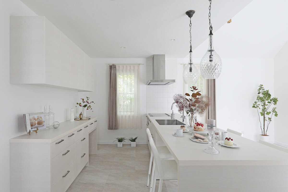 ภายในห้องครัว ทั้งผนัง เคาน์เตอร์ครัว รวมถึงเฟอร์นิเจอร์ต่าง ๆ ถูกตกแต่งในโทนสีขาวทั้งหมด จึงให้ความสวยงามและบรรยากาศที่สะกดทุกสายตา