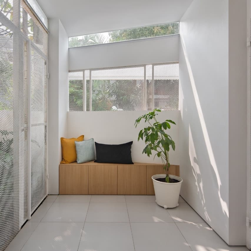 เมื่อเข้ามาภายในบ้าน เราก็จะพบกับมุมเล็ก ๆ หน้าบ้าน โดยเราจะเห็นการตกแต่งที่จะมีการใช้ตาข่ายเหล็กในการติดตั้งรอบบ้าน
