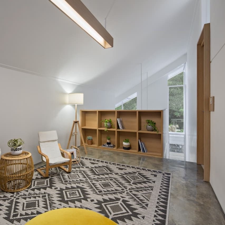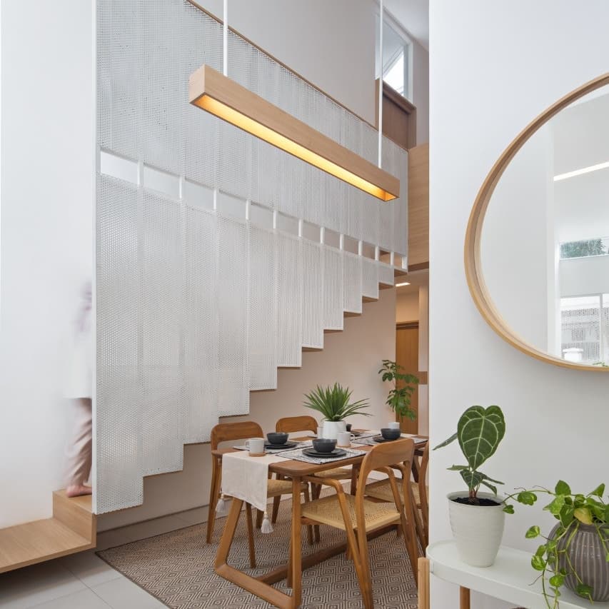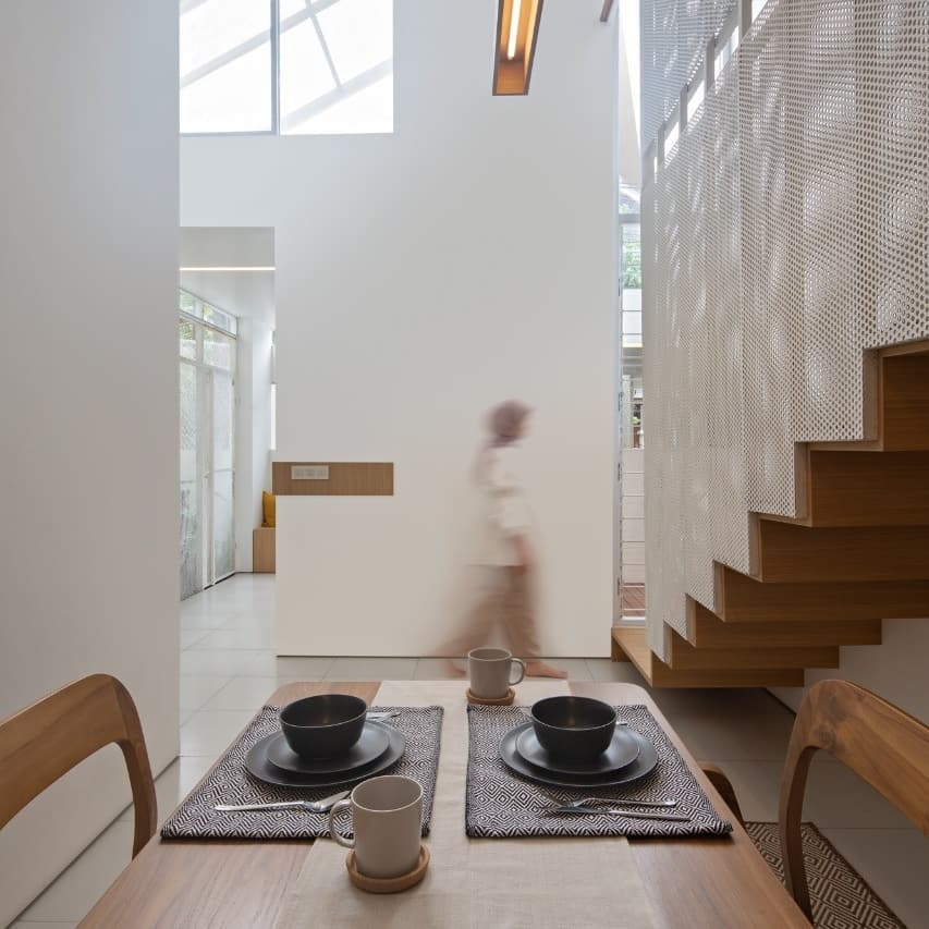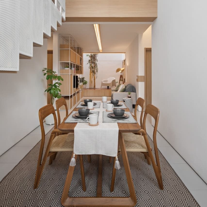 การตกแต่งภายในบ้านจะมีรายละเอียดที่จะเน้นความมินิมอล เฟอร์นิเจอร์ส่วนใหญ่จะเป็นงานไม้ในโทนสีน้ำตาล ซึ่งเข้ากับผนังสีขาวได้เป็นอย่างดี