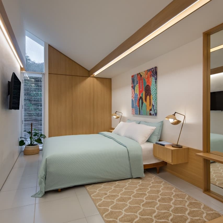 ทางด้านของห้องนอน เป็นอีกห้องที่มีพื้นที่ใช้สอยกำลังดี ภายในจัดวางเฟอร์นิเจอร์เอาไว้อย่างเป็นสัดส่วน พร้อมกับตกแต่งให้มีบรรยากาศที่ผ่อนคลายน่าอยู่