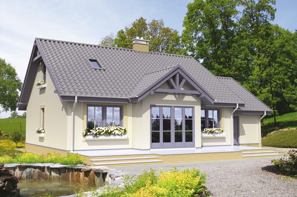 ลักษณะบ้านสองชั้น โครงสร้างบ้านเป็นคอนกรีต ผนังภายนอกทาสีขาวเรียบ เลือกใช้หลังคาทรงหน้าจั่วมุงกระเบื้องโทนสีม่วงจางๆ โดดเด่นที่กระถางดอกไม้บริเวณริมหน้าต่างบ้าน ช่วยให้บ้านดูสดชื่นยิ่งขึ้น