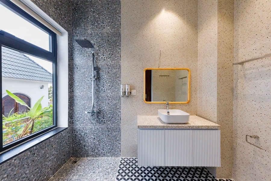 สำหรับห้องน้ำ แม้องค์ประกอบและการออกแบบจะมีความเรียบ ๆ ตามแบบฉบับโมเดิร์น แต่การเลือกใช้ผนังกระเบื้องลายหิน กลับทำให้ห้องน้ำดูมีเสน่ห์ได้อย่างน่าเหลือเชื่อ