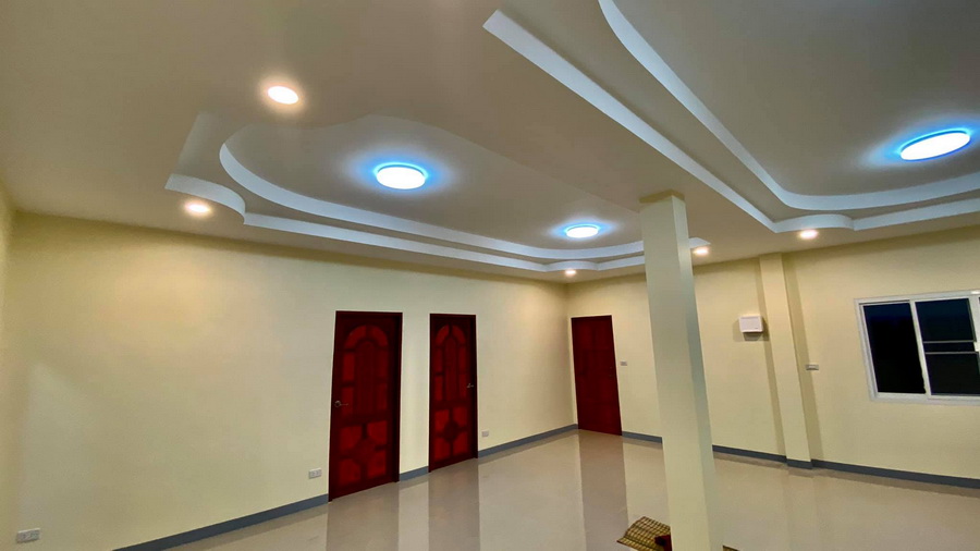 เมื่อเข้ามาภายในบ้าน เราก็จะพบกับห้องโถงขนาดใหญ่ของบ้าน ผนังภายในเลือกใช้สีครีม ให้บรรยากาศที่อบอุ่น เพดานของห้องออกแบบเป็นเพดานแบหลุมพร้อมไฟเพดานแบบโมเดิร์น