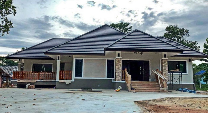 สวัสดีค่ะเพื่อนๆ ชาวเว็บ ในบ้าน ทุกท่าน วันนี้เรามี บ้านหน้ากว้างสไตล์คอนเทมโพรารี มาฝากค่ะ เป็นบ้านชั้นเดียวขนาดกลาง ภายนอกแต่งแต้มด้วยโทนสีพื้นเป็นหลัก โดดเด่นด้วยรูปทรงบ้านปั้นหยา พร้อมพื้นที่ใช้สยครบครันและมุมพักผ่อนนอกบ้าน เราลองไปชมกันเลยดีกว่า