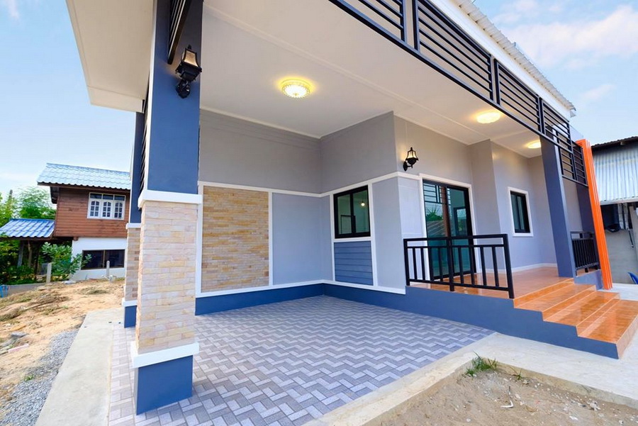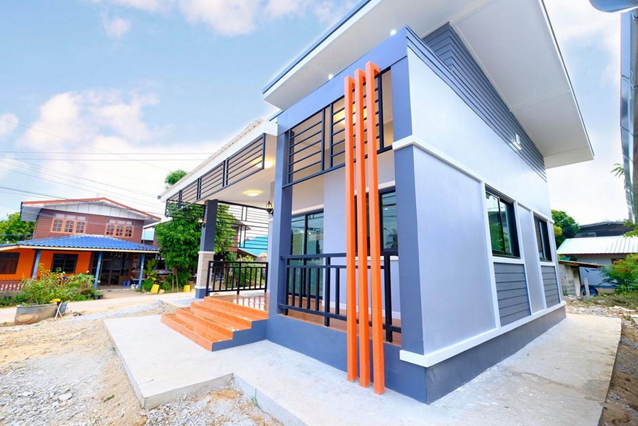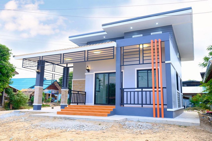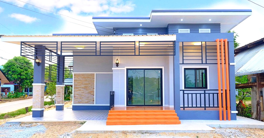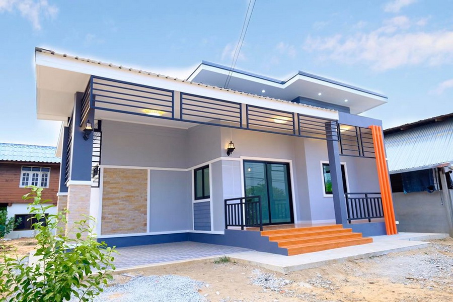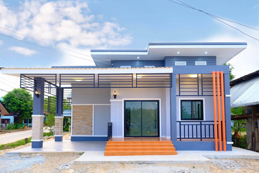 ลักษณะบ้านชั้นเดียว ตัวบ้านถูกออกแบบในสไตล์โมเดิร์นในแบบที่เราคุ้นตากันดี ตกแต่งด้วยโทนสีฟ้าสดใส หลังเป็นแบบเพิงหมาแหงนที่เข้ากันกับทรงสี่เหลี่ยมของบ้าน การออกแบบหน้ากว้างทำให้บริเวณด้านหน้ามีพื้นที่ให้ตกแต่ง และใช้งานได้อย่างเต็มที่เลยทีเดียว