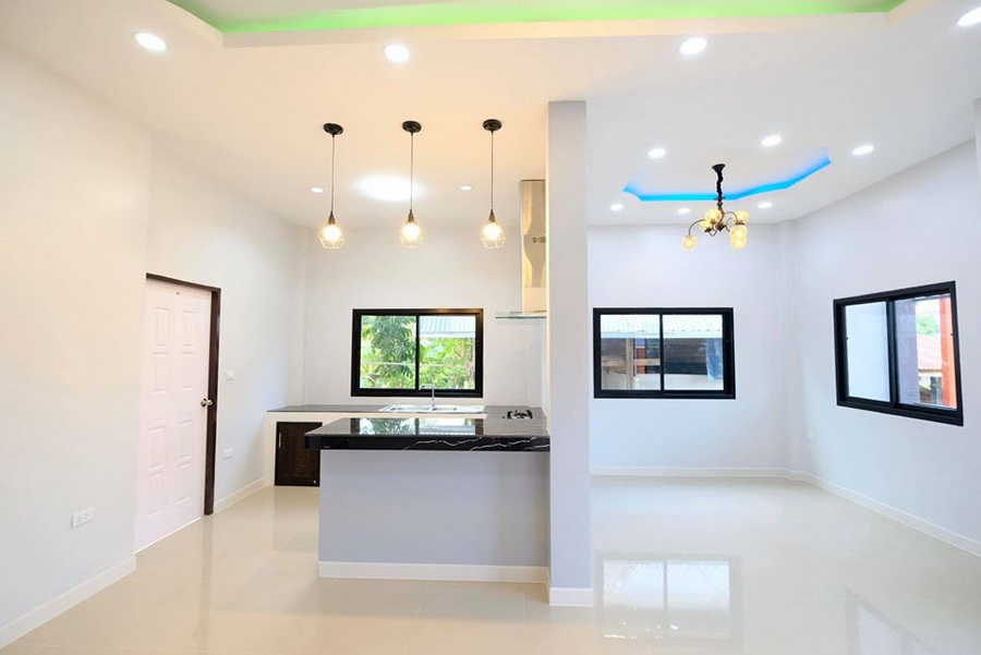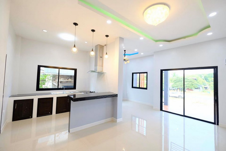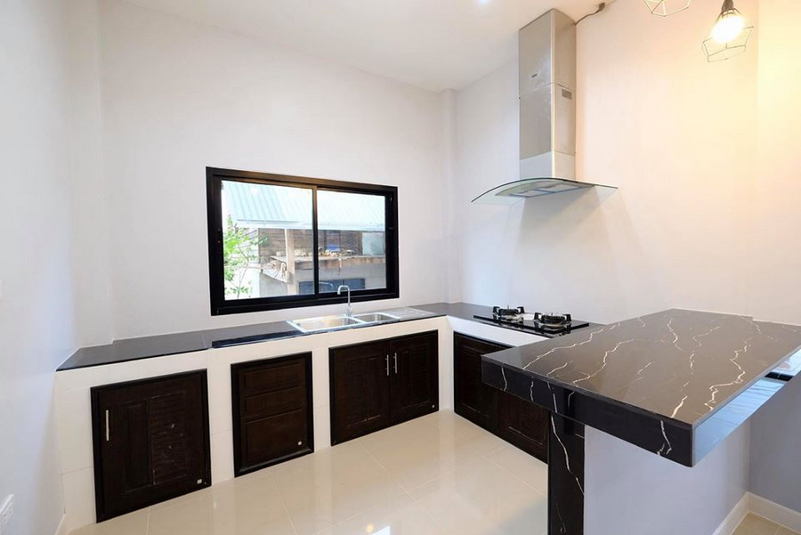ถัดมาจากห้องนั่งเล่นจะเป้นห้องครัวที่ภายในมีพื้นที่ใช้สอยที่เพียงพอต่อการใช้งาน ติดตั้งด้วยเคาน์เตอร์ครัวแบบติดผนัง ปูท็อปเคาน์เตอร์ด้วยกระเบื้องลายหินอ่อนสีเข้ม