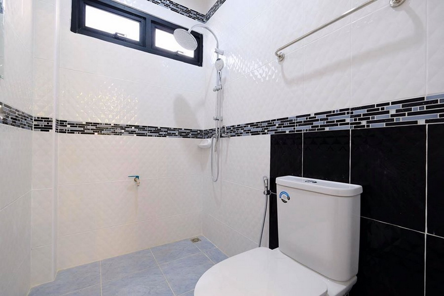สำหรับห้องน้ำเป็นห้องที่ถูกออกแบบและตกแต่งอย่างเรียบง่ายด้วยกระเบื้องโทนขาว-ดำ ภายในมีสิ่งอำนวยความสะดวกที่ครบครัน