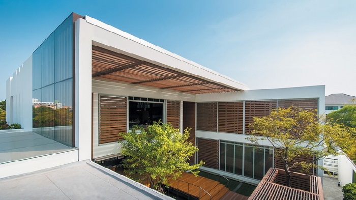 จุดเด่นของบ้านหลังนี้คือพื้นที่ภายนอกตัวบ้านที่ออกแบบเปิดโล่งกว้าง ด้านบนและเพดานตกแต่งด้วยระแนงไม้สีน้ำตาล เพื่อช่วยลดแสงแดดให้พอดี ด้านล่างออกแบบให้เป็นสะพานต่างระดับพร้อมต้นไม้ที่ให้ความสวยงามสดชื่นในพื้นที่