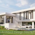 บริเวณหน้าบ้านออกแบบโปร่งโล่งด้วยผนังกระจกใสที่ทำให้ภายในบ้านมีบรรยากาศที่ผ่อนคลาย นอกจากนี้ภายนอกบ้านถูกเทพื้นด้วยปูน พร้อมยกรั้วสูงเพื่อให้บ้านดูเป็นสัดส่วน